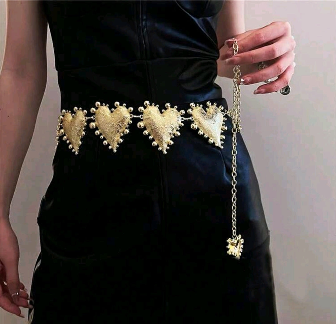 French retro-inspired metal waist chain belt with a large heart and tassel detail