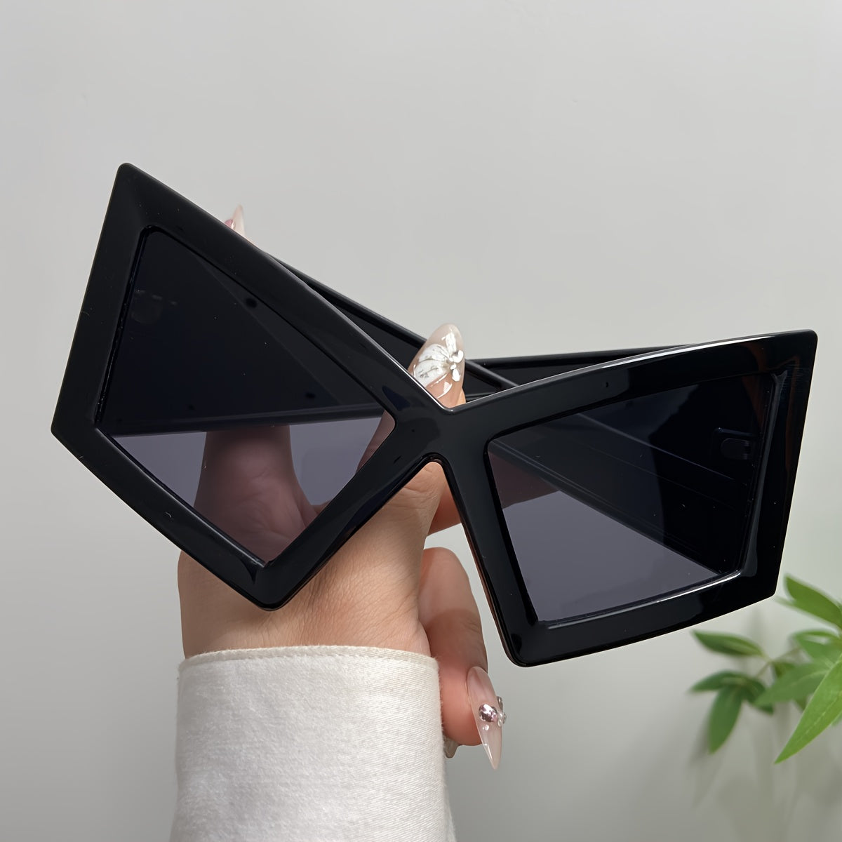 Oversized futuristic sunglasses with sharp angular frames in glossy black. Designed to stand out, these shades combine bold fashion with a modern edge, making them the perfect statement piece for parties, fashion shoots, or street style looks.