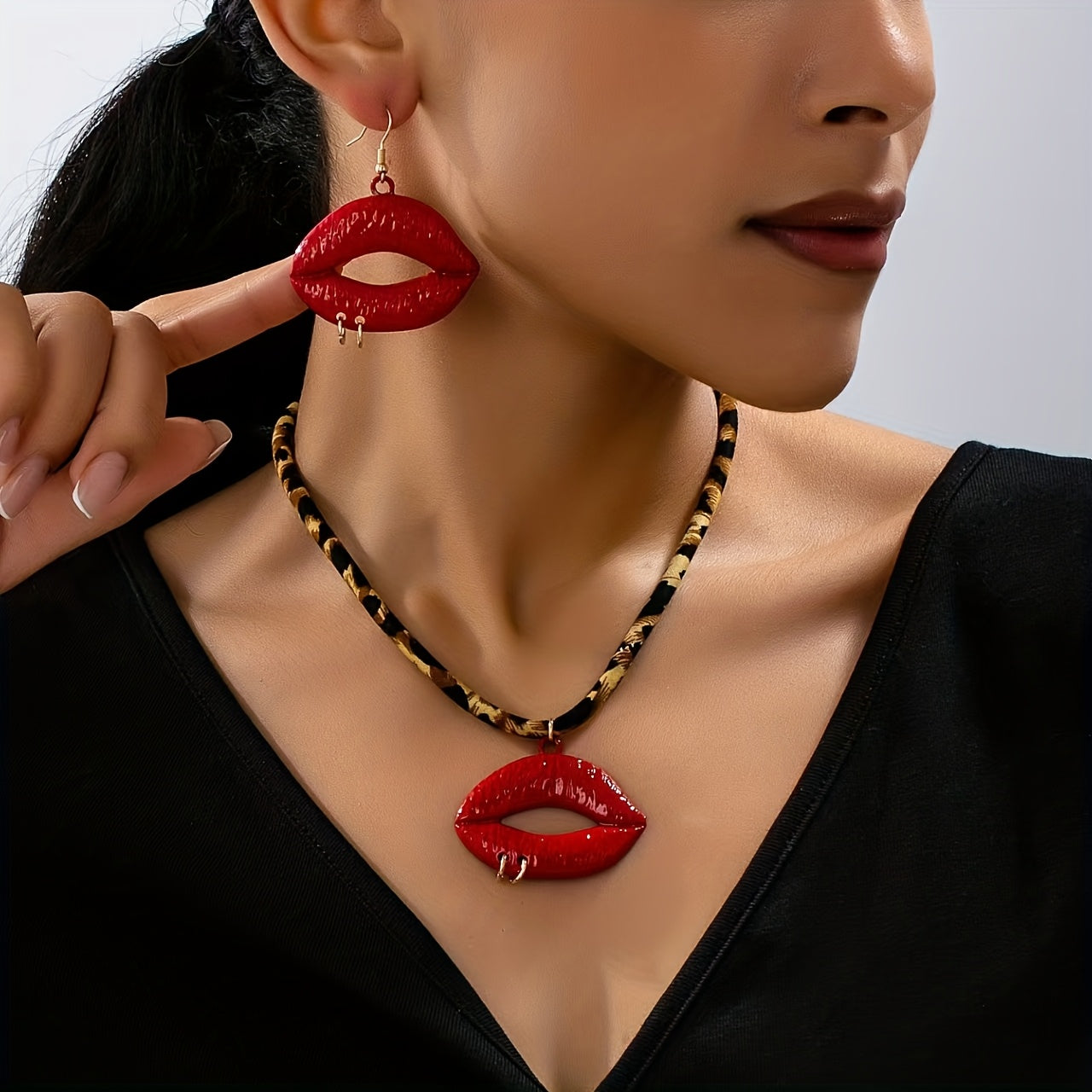 لرئيسية/أحدث المنتجات/Bold Red Lips Necklace & Earrings Set