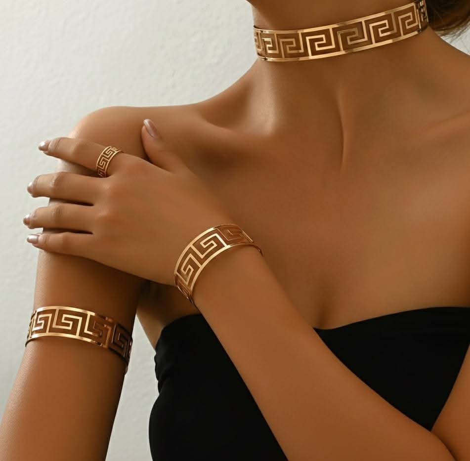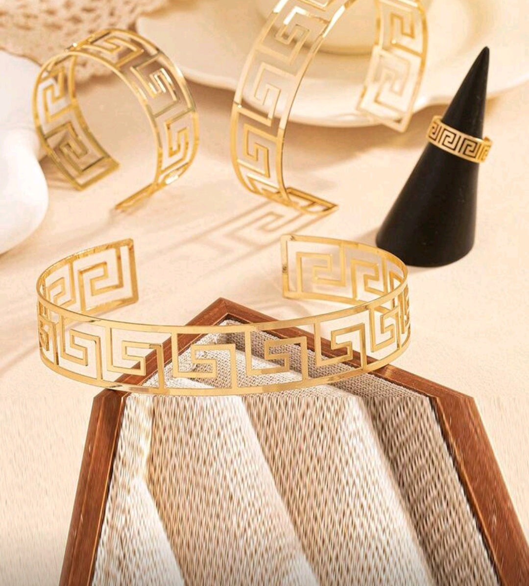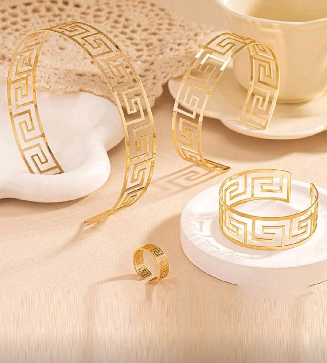GNIT 4-Piece Jewelry Set Consisting Of A Gold Fashion Hollowed Out Collar, A Gold Fashion Hollowed Out Arm Bracelet, A Gold Fashion Hollowed Out Bracelet, And A Gold Fashion Hollowed Out Ring, Suitable For Women's Daily Wear. It Is A High-End Jewelry Euro