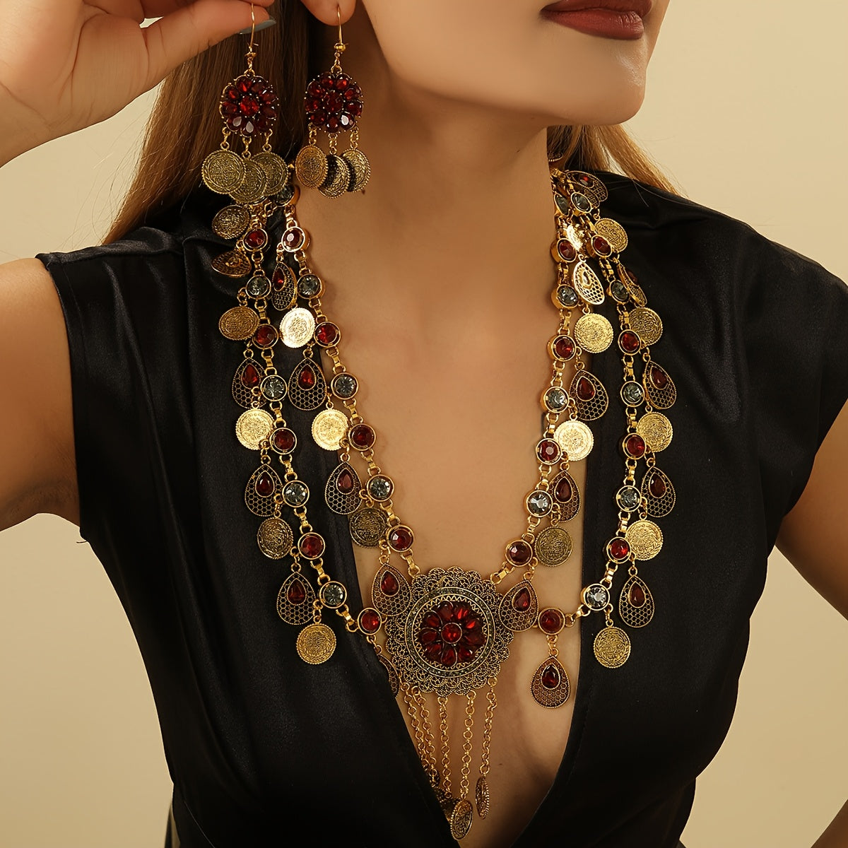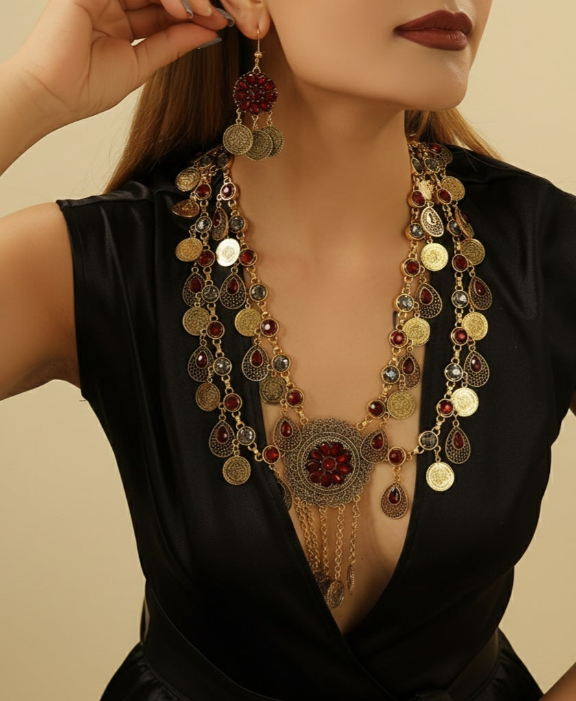 Add a touch of vintage charm to your look with this beautiful jewelry set. Featuring deep garnet-colored stones embedded in classic coin-inspired designs, this set includes a matching necklace and earrings. Perfect for evening events, festive occasions, or adding a sophisticated accent to your everyday outfit. Lightweight, durable, and designed to make a statement.