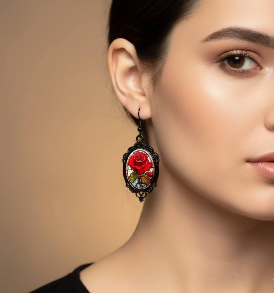 Add a touch of elegance and romance to your look with these stunning black drop earrings featuring a delicate red rose design. Perfectly crafted for women who love floral-inspired jewelry with a modern twist.