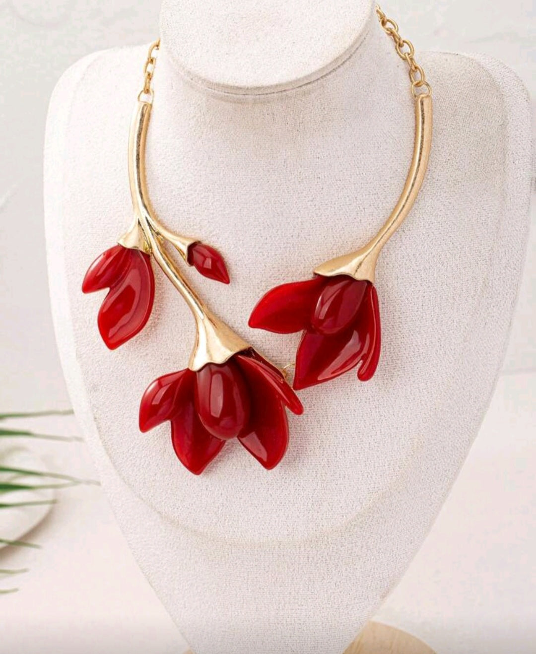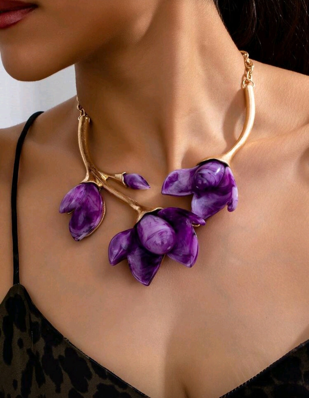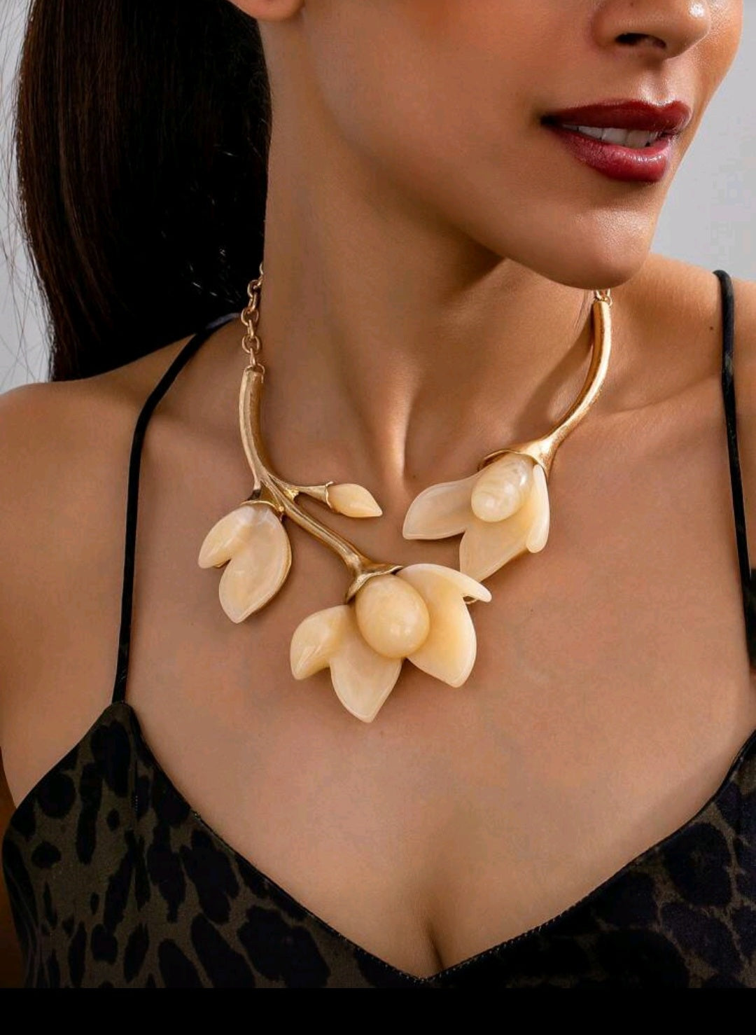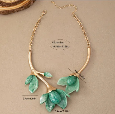 1pc Retro Boho Exaggerated Metallic Green Magnolia Flower Elegant Resin Floral Necklace Valentines,Mom,Mother,Mother's Day,Gift