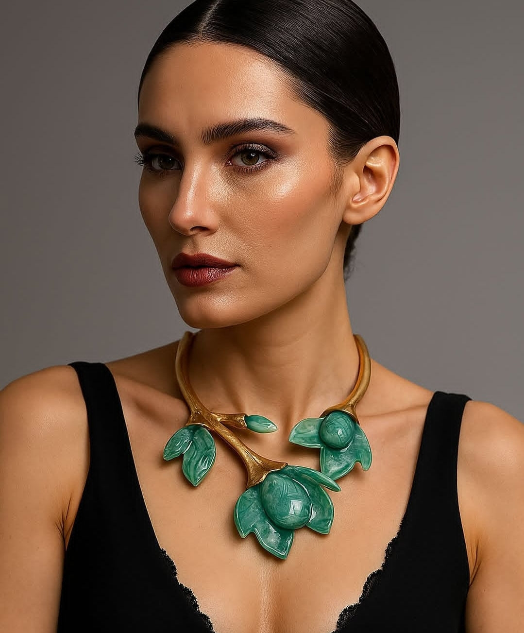 ● 1pc Retro Boho Exaggerated Metallic Green Magnolia Flower Resin Necklace