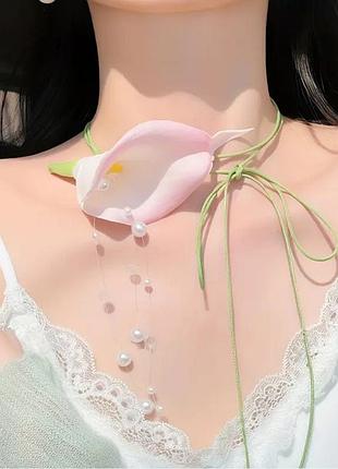 Elegant Romantic Pink Floral Calla Lily Necklace with White Pearl Resin Water Drop Tassel Choker – Short Necklace for Women