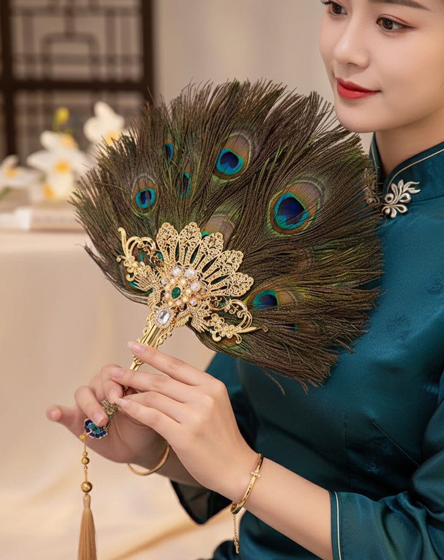 Peacock Feather Hand Fan with Gold Handle and Imitation Diamond Decoration