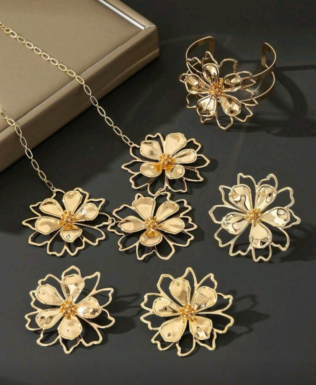 Home/Newest Products/Golden Rose Jewelry Set – Earrings, Ring, Bracelet & Necklace – Elegant Floral Design