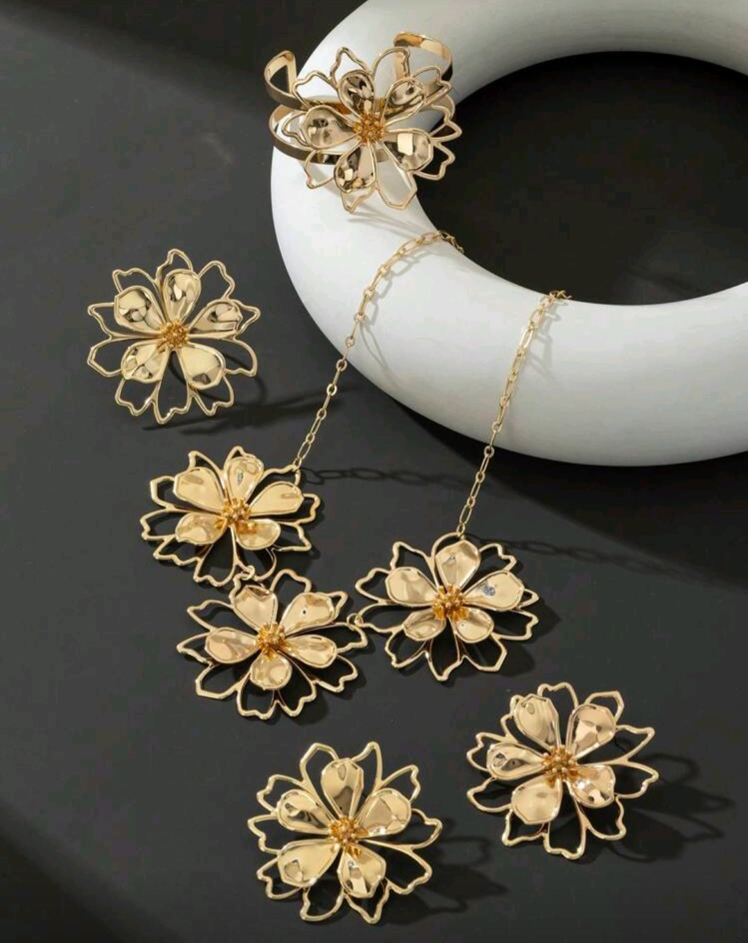 التصميم: تصميم وردة أنيق، يشمل حلق، خاتم، سوار وقلادة