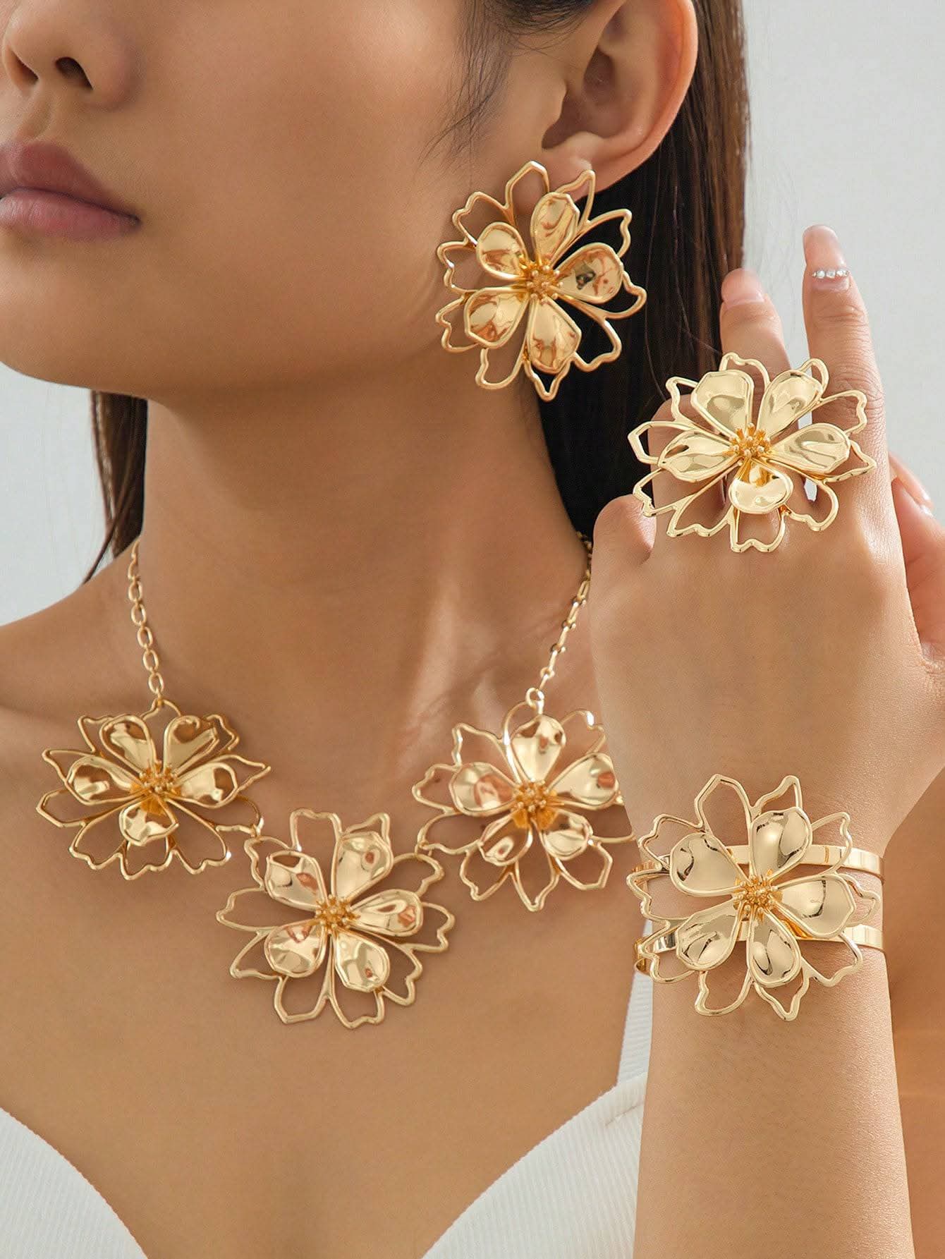 Golden Rose Jewelry Set – Earrings, Ring, Bracelet & Necklace – Elegant Floral Design