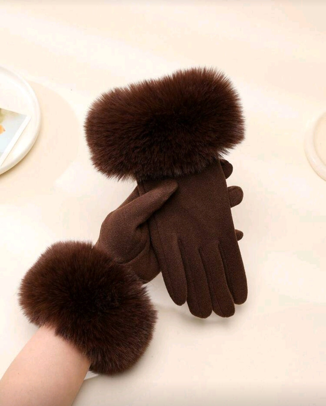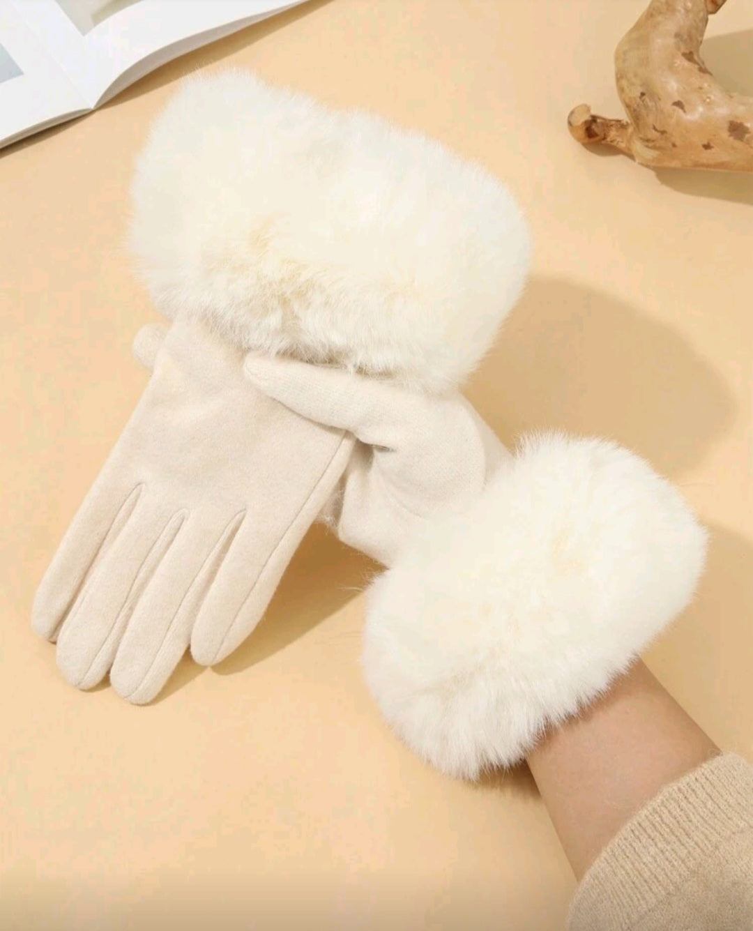 • ● Pair of women’s white high-density faux wool gloves, designed for warmth, comfort, and everyday winter use,
