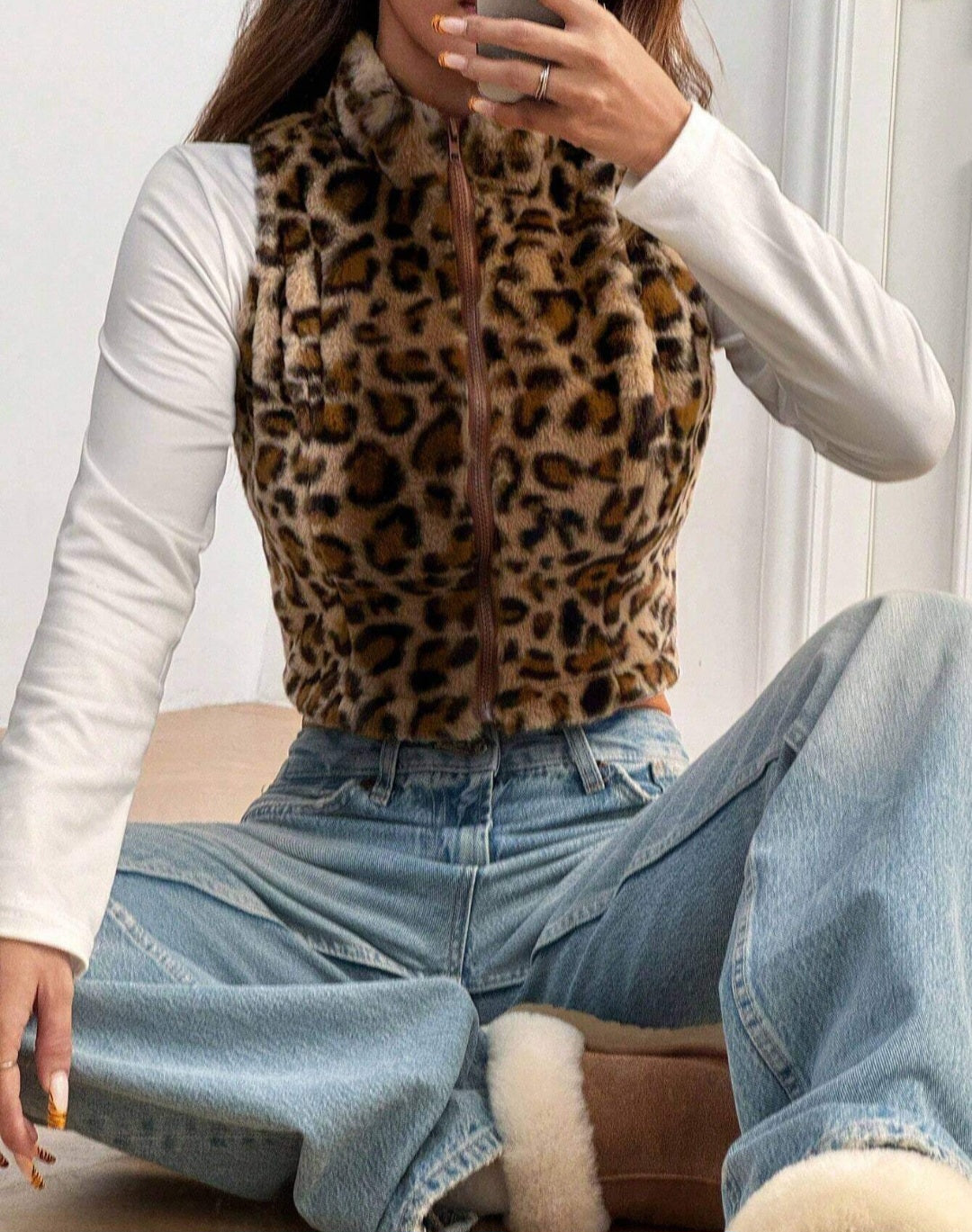 EZwear Women’s Leopard Print Fleece Zip-Up Sleeveless Jacket BY SHEIN