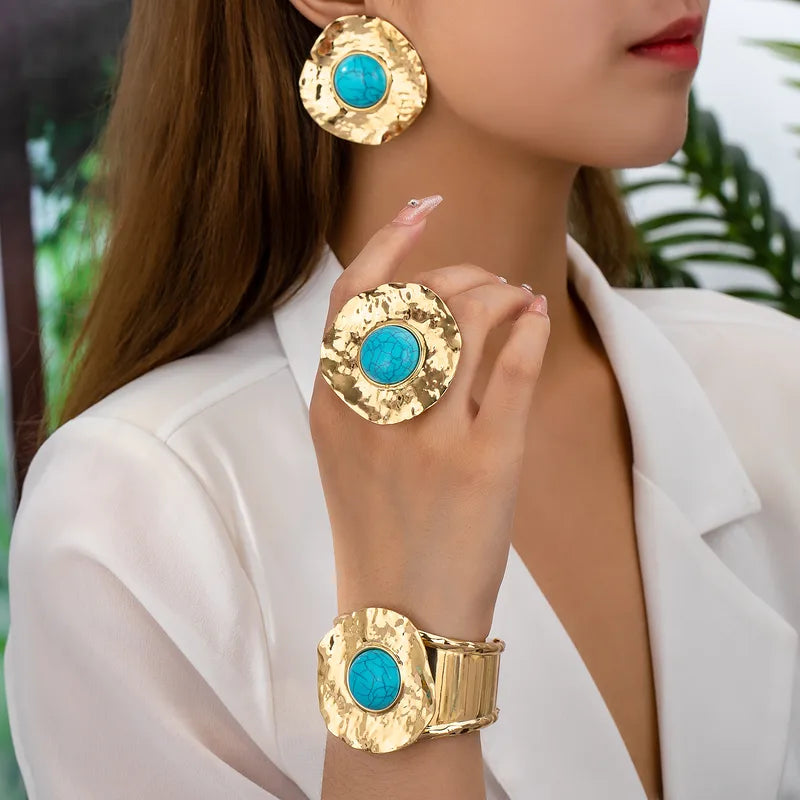 أضيفي لمسة من السحر الكلاسيكي إلى مجموعتك مع هذا الطقم النسائي المستوحى من الطراز العتيق المزخرف بالفيروز. يتميز بتصميم دائري كلاسيكي مرصع بحجر الفيروز الزاهي، ليجمع بين أناقة الماضي ولمسة عصرية راقية. مصنوع من سبيكة معدنية متينة ليكون خفيف الوزن وأنيق في نفس الوقت، مما يجعله مثاليًا للاستخدام اليومي أو المناسبات الخاصة. مناسب لـ الحفلات، الأعراس، السفر أو كهديّة مميزة، وهو قطعة أساسية لعاشقات الإكسسوارات الفريدة والعصرية.