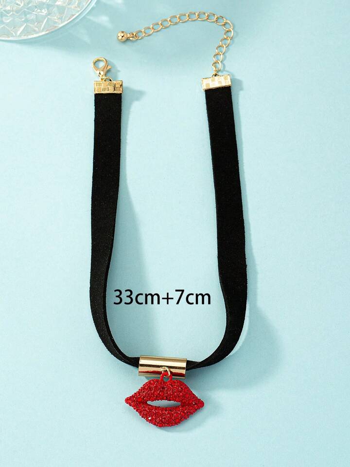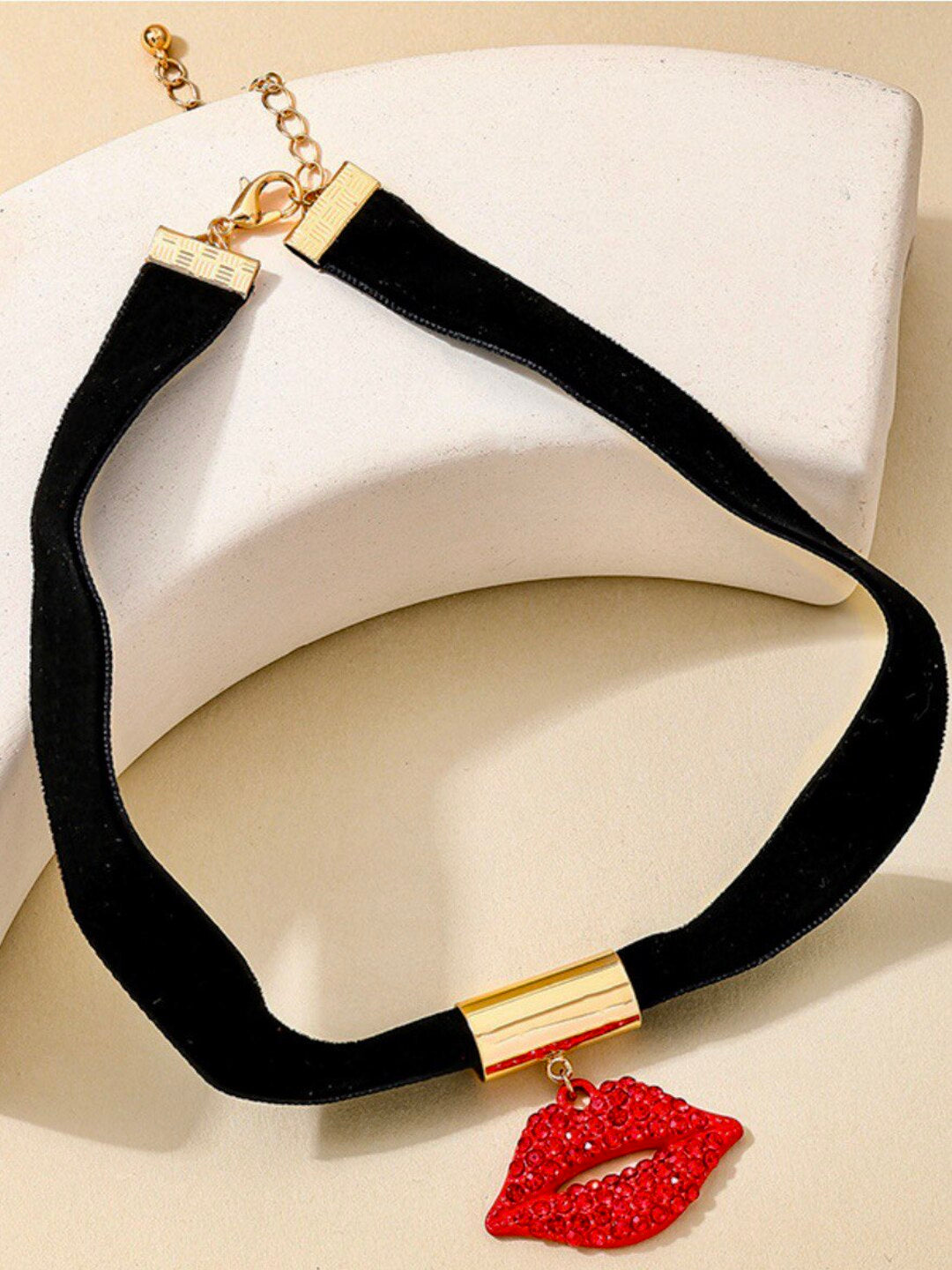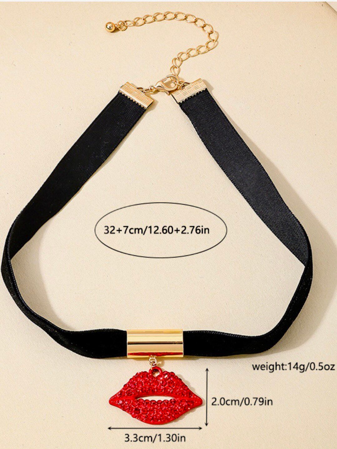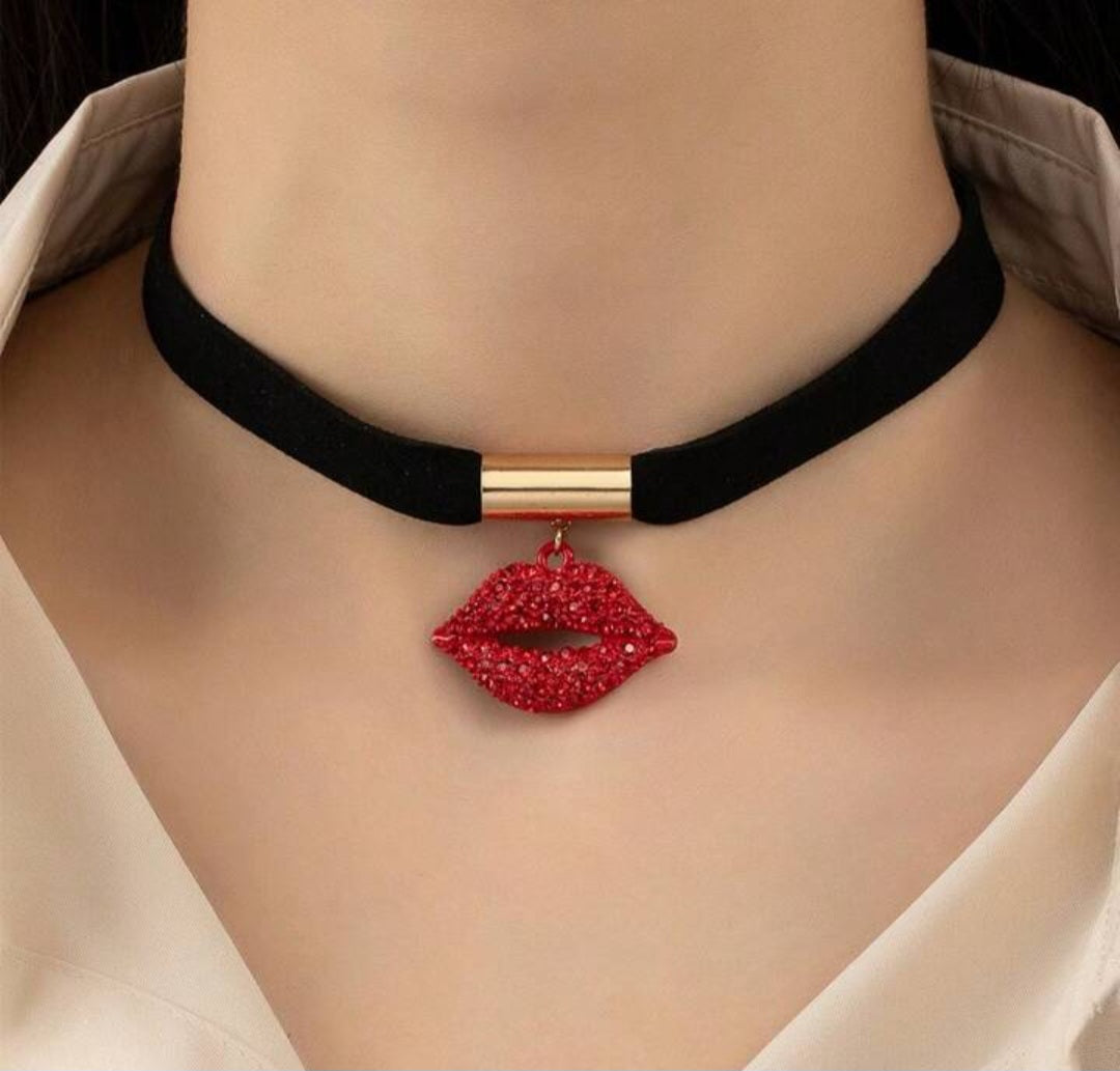 Make a bold statement with this unique necklace featuring vibrant red lips paired with a large flower accented by a striking turquoise stone.-